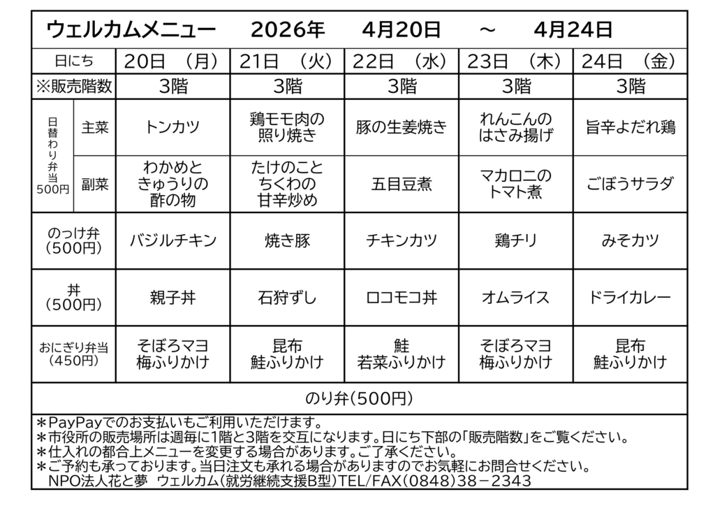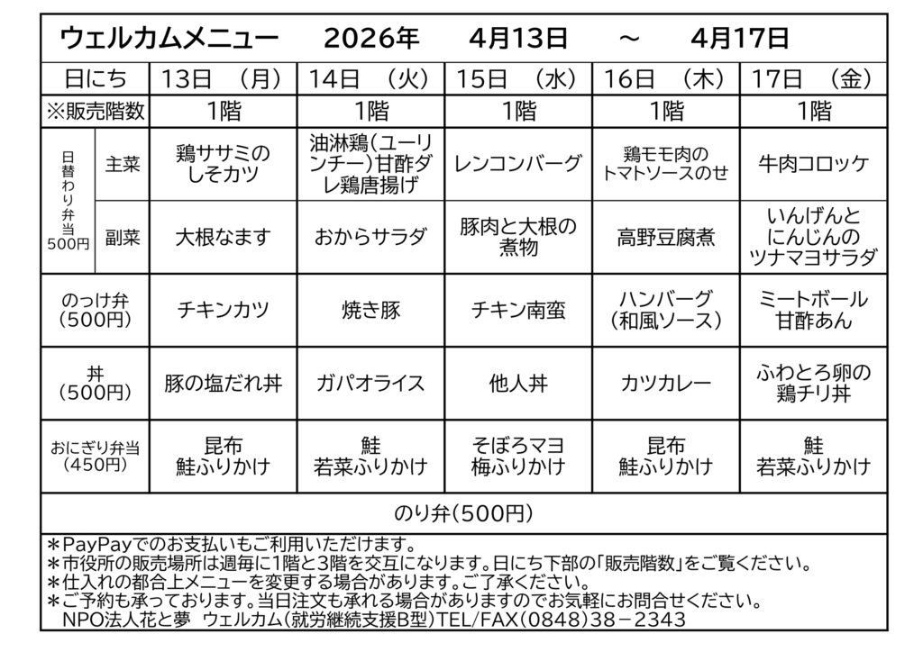〇おにぎり弁当「350円」→「450円」に変更。